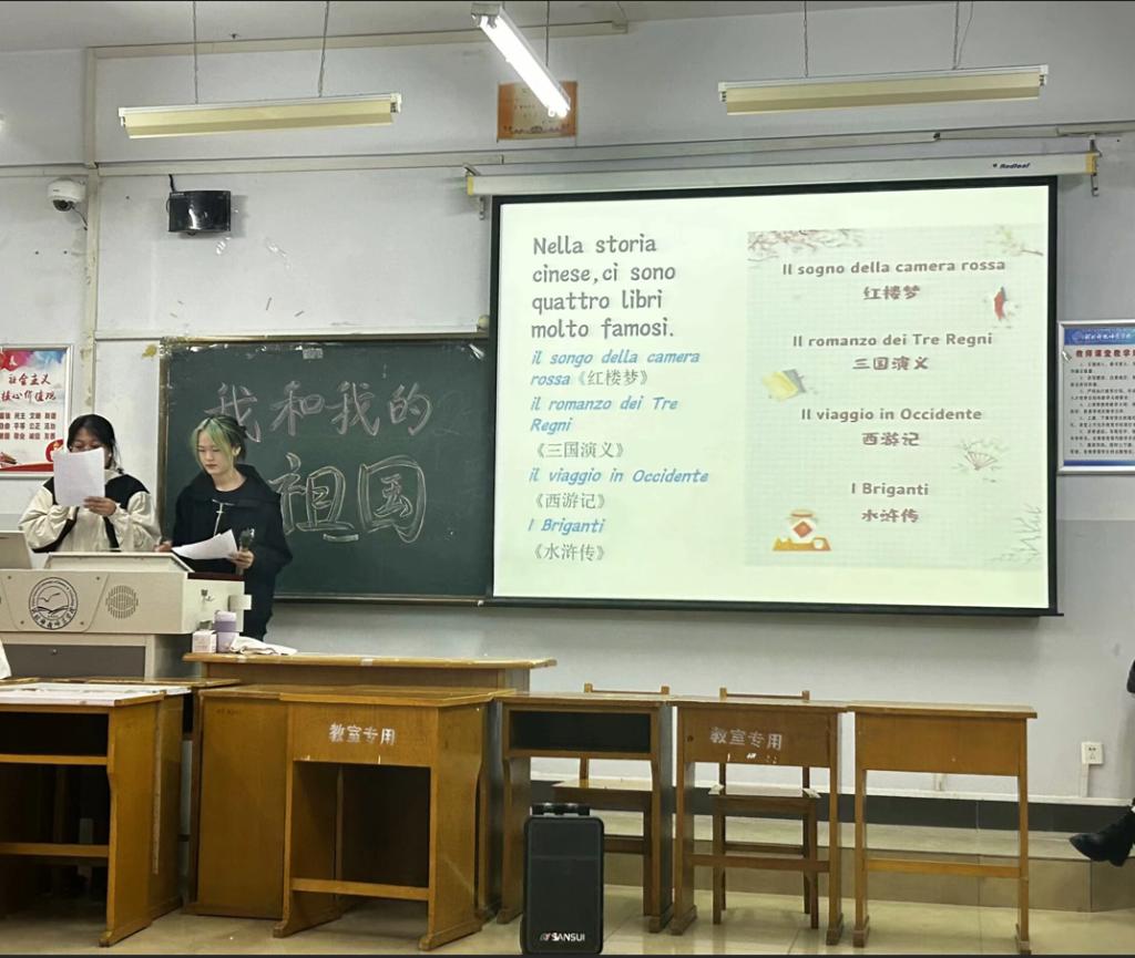 为了进一步加强爱国主义教育,将中国梦的核心牢记于心,同时将所学专业知识与热爱祖国联系在一起,并以多样的才艺迸发绚烂的色彩,yl8858永利集团意大利语专业2301班全体同学于2024年10月22日在开发区综合楼406组织开展“我和我的祖国”系列才艺比拼。