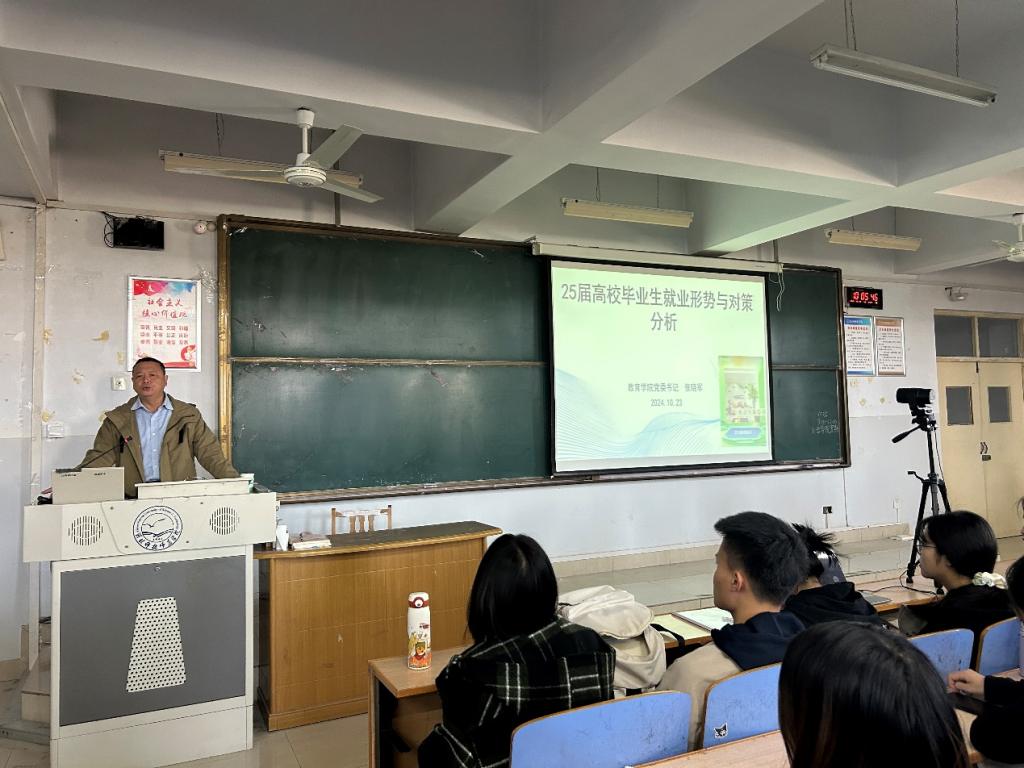 为了让同学们充分了解就业形势,合理规划职业发展路径,2024 年10月23日,yl8858永利集团邀请教育学院张晓军书记作《25届高校毕业生就业形势与对策分析》专题宣讲会。讲座由yl8858永利集团党委负责人主持,2021 级及2022级全体在校生300余人聆听了讲座。