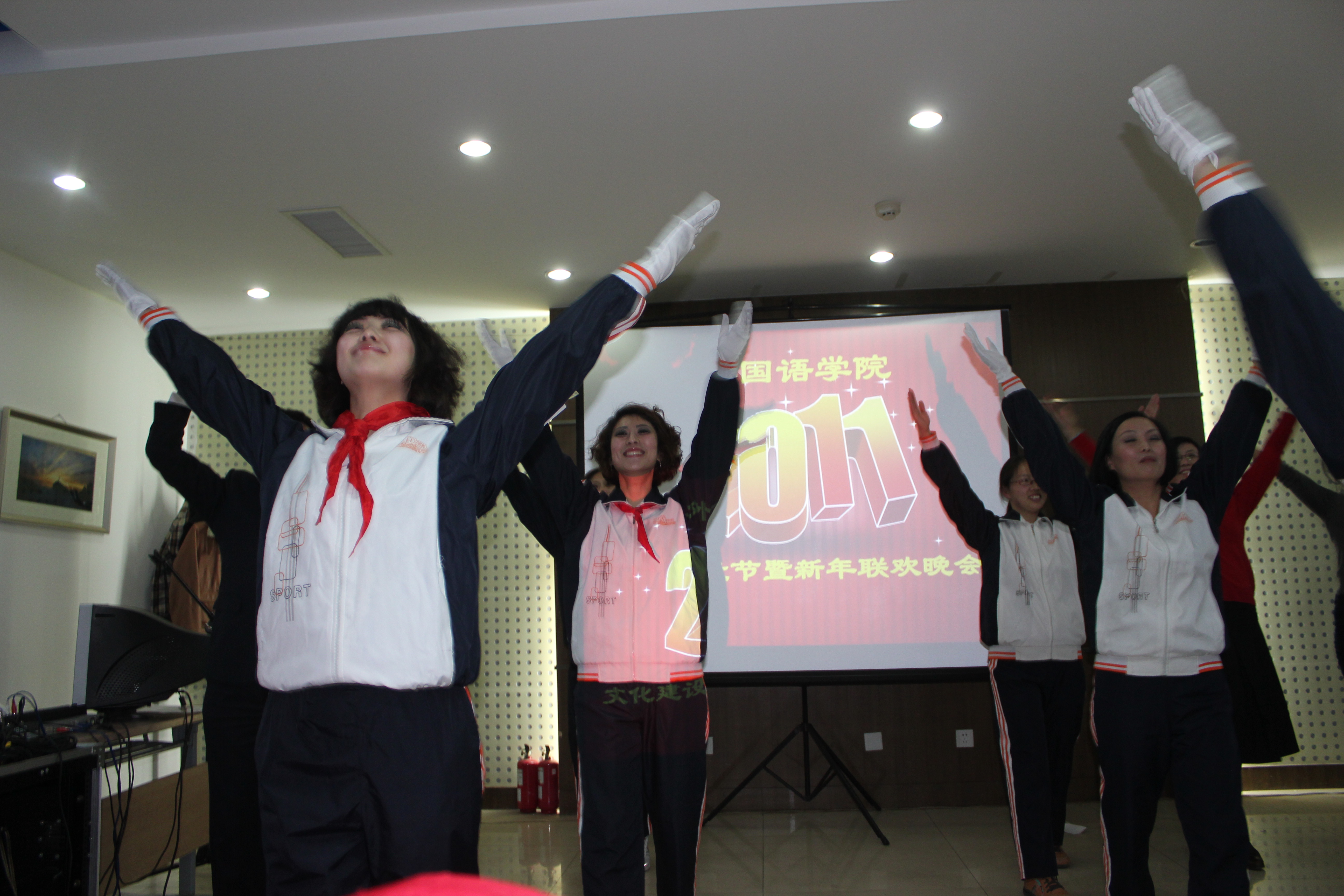 联欢会在院党委书记刘朝晖同志幽默、给力的致辞声中开始。在主持人邵东蕊和孙晓萌铿锵有力的声音引导下,教师们精心准备的节目依次上演:以马晓迎老师为首的应用英语教研室的老师们带领在场的其他老师们做起了第八套广播体操,让大家重温了青春岁月;两个曾经的老兵游建民和吴玉新老师又重新“扛起了革命的枪”;办公室与学工办的老师们联手为大家献上了一出“杨白劳与黄世仁”;以邵院长和崔院长为首的“舞蹈家”们为大家跳了一段精彩火爆的舞蹈-开门红;郭文颖、李爽等几位老师的舞蹈“吉祥谣”在联欢会上吹起了一股藏族风,“谋杀”胶卷无数。本次联欢会精彩纷呈,教师们纷纷上台表演,唱歌跳舞,说拉弹唱,真是丰富多彩,就像刘朝晖书记所说的那样:老师们纷纷一改往日的严肃,真正的做到了“颠覆自我”。