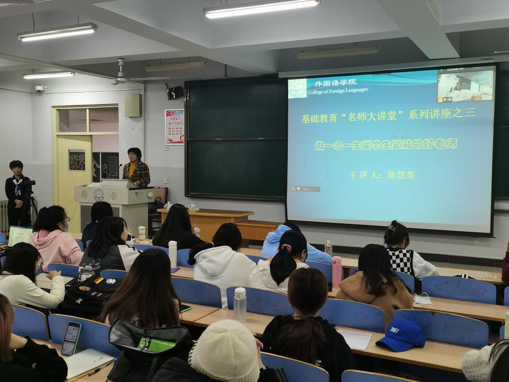 2021年11月18日下午,yl8858永利集团在综合楼312召开了英语专业2020级教育见习师德与教师角色专题讲座,此次讲座是我院“名师大讲堂”的系列讲座之三。特邀主讲人为秦皇岛市海港区教体局高级教师陈慧英老师,陈老师是英语专业2020级的校外导师,河北省中小学省级培训专家团队成员、秦皇岛市首批学科带头人。
