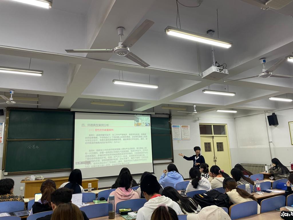 陈慧英老师首先以“如何做一名合格的人民教师”为题向学生们提问,引发学生们思考教师教育的内涵,并借由《道德经》中德的体现及《说文解字》对德的剖析,启发学生们进行个性化思考:什么是德?什么是师德?之后陈老师从教师职业道德相关的法律法规入手,以先贤孔圣和习近平总书记的师德观为例,解读如何树立科学、正确的师德观;通过对十则显性的负能量案例与隐性的负能量案例的具体分析,引导同学们设身处地地思考做一名好老师应该具备的条件;并通过河北农业大学李保国教授的先进事例,鼓励同学们向李保国教师学习,恪守职业道德,积极奉献社会;此外,陈老师还指出作为老师应时时刻刻注意慎言慎行慎独。最后,陈老师就“如何做一名一生受学生爱戴的好老师”进行了五方面的阐释:牢记立德树人的使命,做有理想信念、有责任担当的老师;树立终身学习意识、做有扎实学识的好老师;爱岗爱生,做有仁爱之心的好老师;廉洁从教,做有底气、有骨气、有正气的好老师;树立团结协作意识,处理好与他人的关系,做有大局意识的好老师。