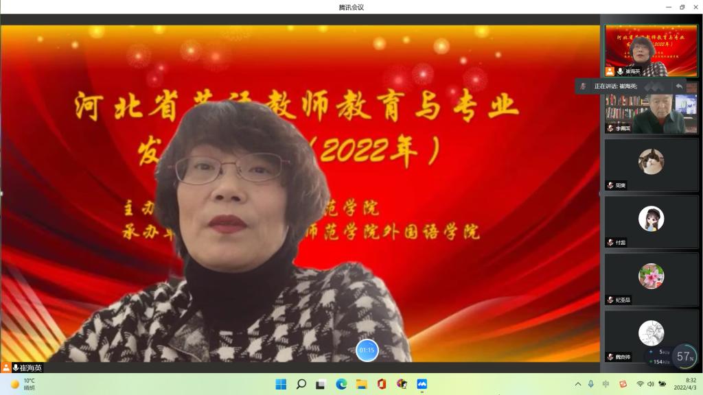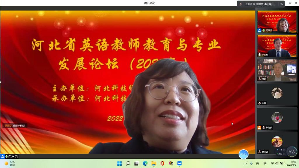 4月3日,由yl88858永利中国主办,yl8858永利集团承办的2022年河北省英语教师教育与专业发展论坛以腾讯会议形式线上召开,由yl8858永利集团崔海英院长和范学荣副院长主持,特邀全国著名师范院校的五名专家、一位基础教育学校校长共同探讨河北省英语教师教育与专业发展的议题。学校党委副书记李佩国教授致开幕辞。