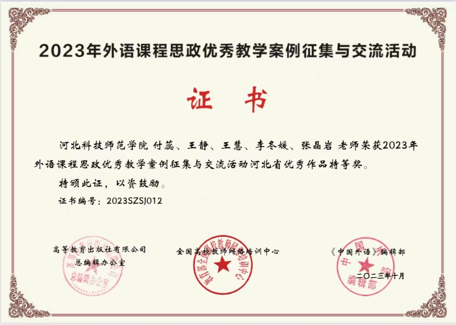 为全面推进高校外语课程思政高质量建设,落实立德树人根本任务,高等教育出版社于2023年4月启动外语课程思政优秀教学案例评比活动,经过专家委员会评审,我院付蕊老师团队获得省级特等奖。