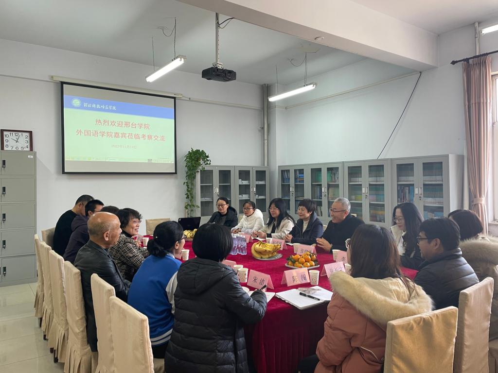 11月14日,邢台学院yl8858永利集团副院长赵清丽、副书记张恒泽一行7人来我校yl8858永利集团考察交流。yl8858永利集团院长崔海英主持座谈会,副院长范学荣、罗学锋,英语教学部主任王静、宋洁,公共英语教学部主任韩庆山,学工办主任赵赓参与座谈。