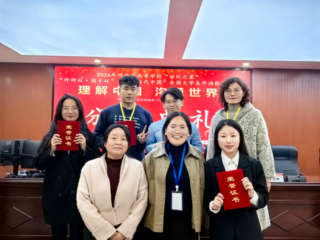 2024年11月9日,河北省高等学校“世纪之星”“外研社·国才杯”“理解当代中国”大学生外语能力大赛演讲、口译赛项在石家庄学院火热开启。经过激烈角逐,在全省本科及研究生英语演讲赛项中,我校学生胡开升在75名选手中脱颖而出,以第四名的成绩荣获大赛金奖,将代表河北省参加全国总决赛;李瑛钦荣获银奖;卢洪洋、时祺和王凯伦获得铜奖。在英语口译赛项中,李子妍、刘婷婷获得铜奖。