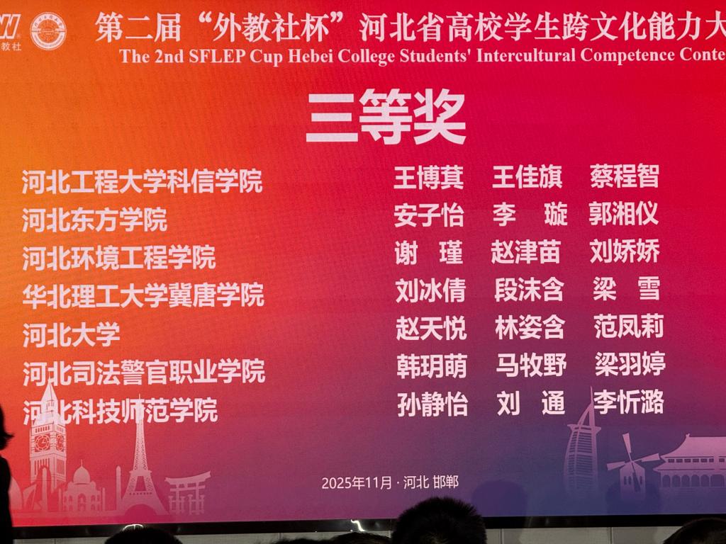 2025年11月14-16日,河北省高等学校“外教社杯”跨文化能力大赛在河北工程大学如期举行。这场覆盖全省多所高校、汇聚外语精英与跨文化人才的巅峰对决,以其高规格赛事标准、高强度竞技节奏,成为检验高校外语教学实力、学子综合素养与跨文化交流能力的核心舞台。在赛场上,我校参赛学子沉着应战、从容不迫,凭借过硬的专业功底、默契的团队协作与卓越的临场应变,以及跨文化大赛专属的国际视野展现、跨文明对话技巧的多重竞技维度中脱颖而出,充分彰显了扎实的语言功底与开阔的全球视野。