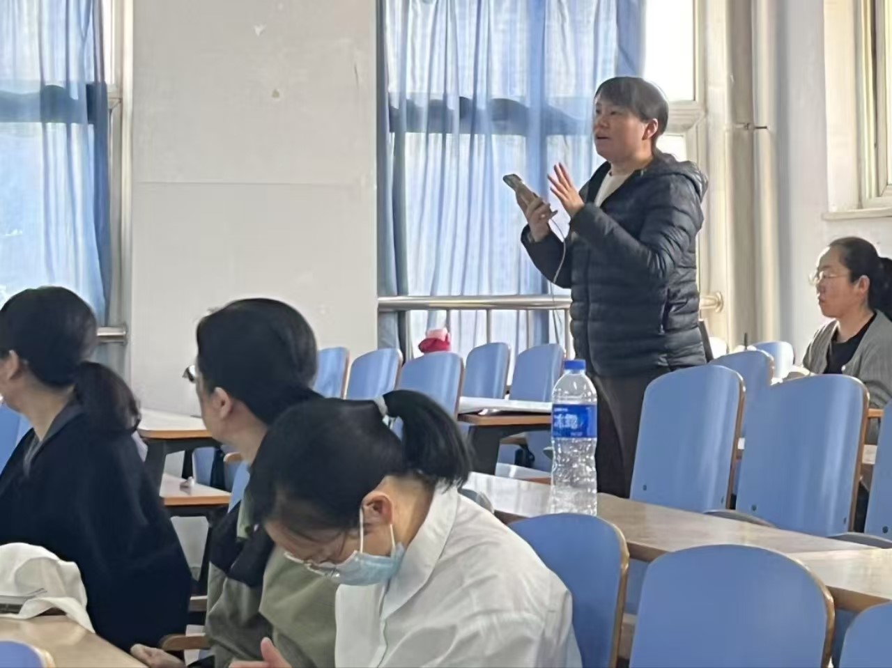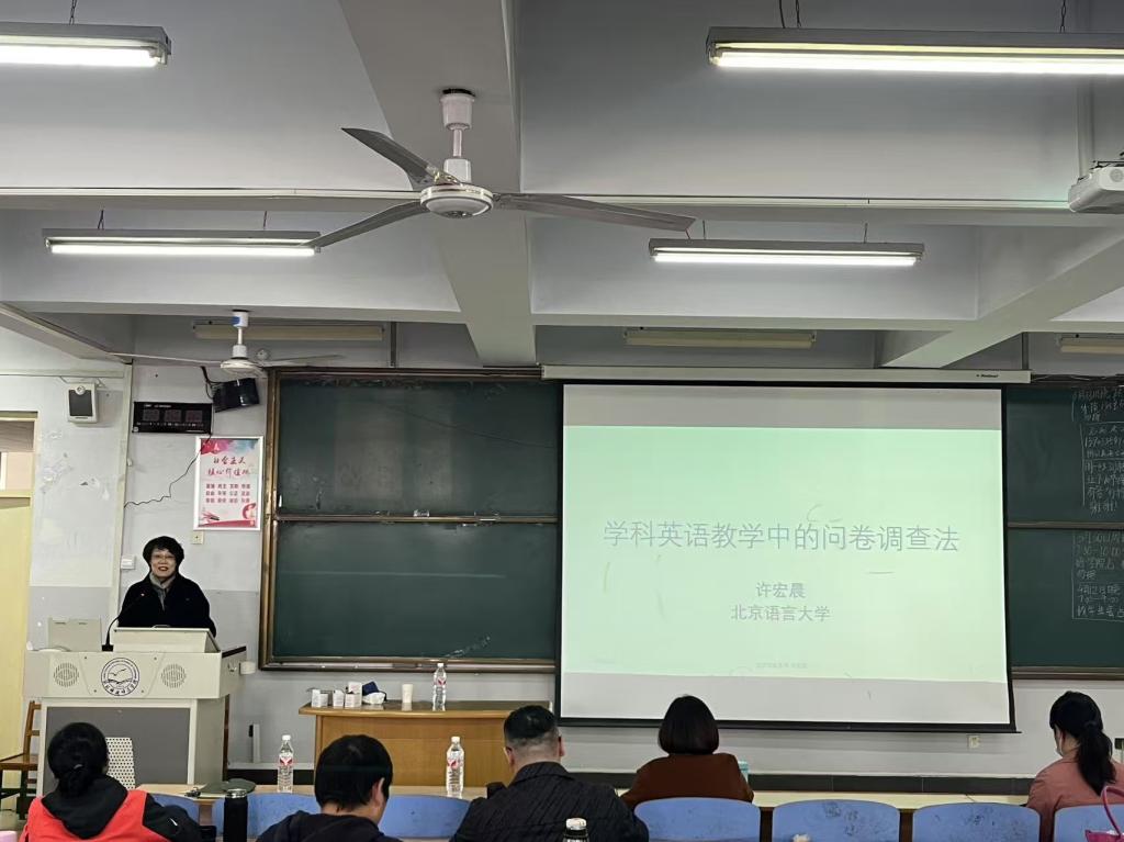 讲座伊始,崔海英院长向与会师生介绍了主讲人许教授的学术背景。许教授现任北京语言大学英语和高级翻译学院教授,其研究领域涵盖教育语言学及应用语言学量化研究方法。在专题讲授环节,许教授系统阐述了学科英语教学研究方法的整体框架,重点围绕问卷调查法展开讲解。主要内容包括:学科英语教学研究方法概览、问卷设计的三个维度、常用问卷题型设计、问卷题项常见错误分析以及问卷数据处理方法等。最后的互动环节中,与会教师积极提问。针对教师们提出的“如何规避问卷中的社会期待效应”、“同一问卷中能否混合使用选择题和李克特量表”等问题,许教授均给予了专业细致的解答。